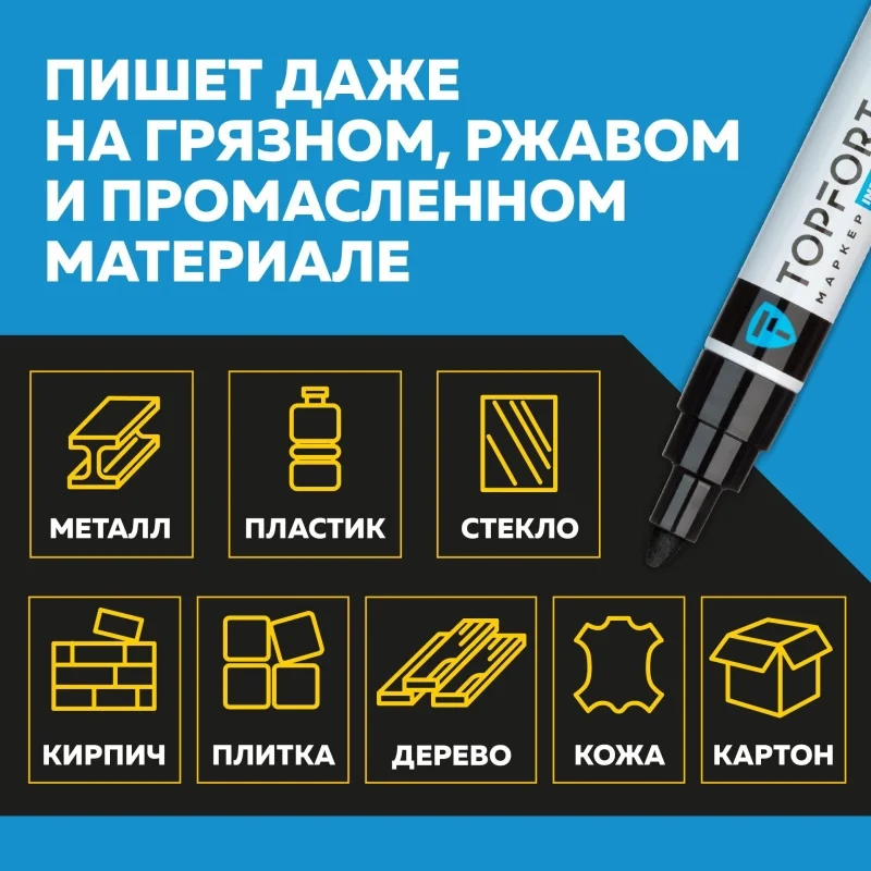 Маркер предназначен для универсальной маркировки различных материалов, включая металл, стекло, пластик, дерево, резину, камень, картон, кирпич, текстиль, кожу, бумагу и бетон. Он обеспечивает нанесение ярких и стойких линий толщиной 6–8 мм, что делает его идеальным для работы с гладкими и шероховатыми поверхностями, а также для применения на загрязнённых или пыльных материалах. Краска на основе нитрокраски с высококонцентрированным пигментом создаёт стойкие и чёткие линии.