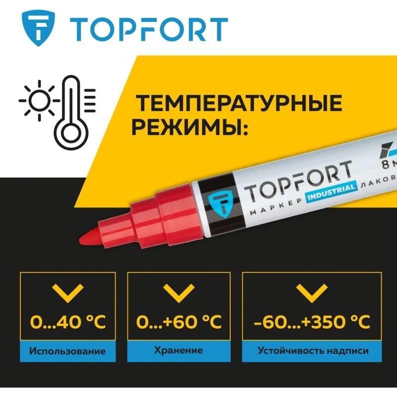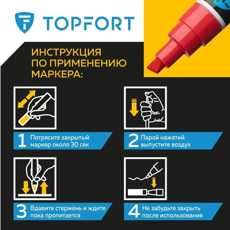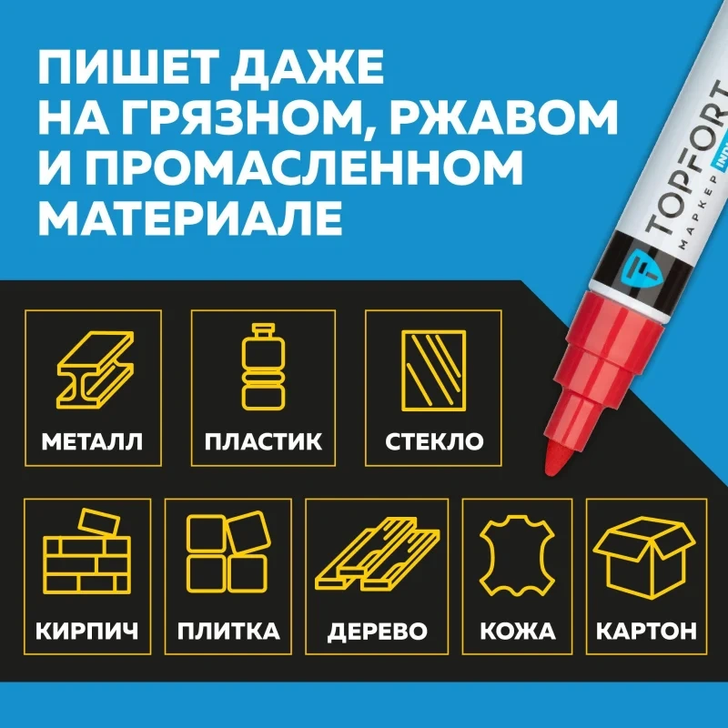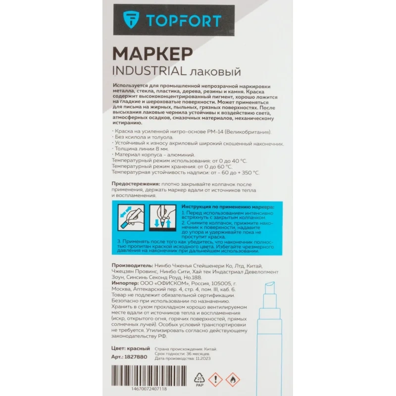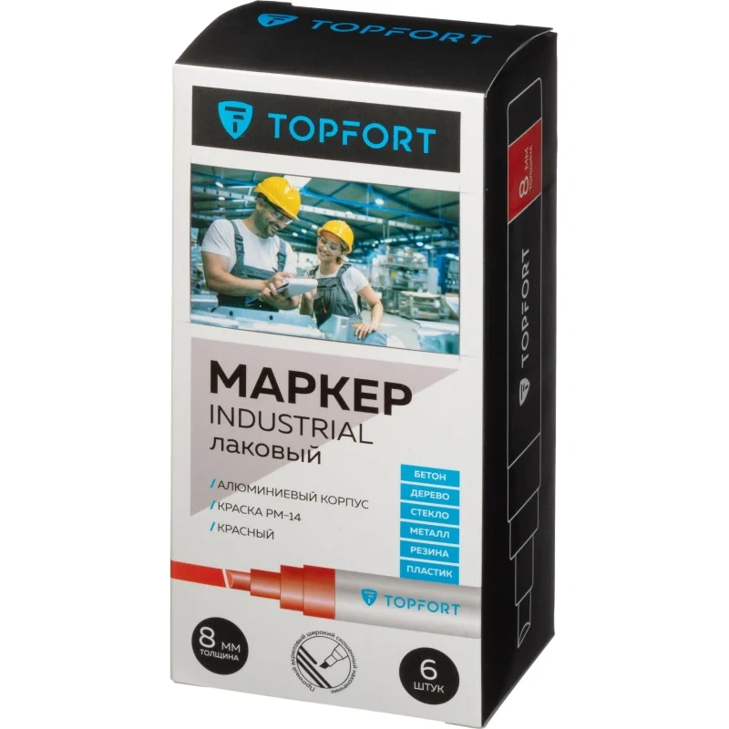 Маркер промышленный TOPFORT Industrial для универсальной маркировки красный (8 мм) предназначен для промышленной непрозрачной маркировки металла, стекла, пластика, дерева, резины, камня, картона, кирпича, текстиля, кожи (материал), бумаги, бетона. Краска содержит высококонцентрированный пигмент, хорошо ложится на гладкие и шероховатые поверхности. Может применяться для письма на жирных, пыльных, грязных поверхностях. После высыхания лаковые чернила устойчивы к воздействию света, атмосферных осадков, смазочных материалов, механическому истиранию. Создает стойкую линию толщиной 8 мм. Длина маркера - 157 мм. Цвет чернил : красный. Особенности: - Краска на усиленной нитро-основе РМ-14 (Великобритания). Без ксилола и толуола. - Устойчивый к износу усиленный акриловый широкий скошенный наконечник (Япония). - Толщина линии 8 мм. - Материал корпуса - алюминий. - Температурный режим использования : от 0 до +40 С. - Температурный режим хранения: от 0 до +60 С. - Температурная устойчивость надписи: от -60 до +350 С. Инструкция по применению: 1. Перед использованием интенсивно встряхните маркер с закрытым колпачком. 2. Снимите колпачок, прижмите наконечник к поверхности, надавите до упора и удерживайте пока не проступит краска. 3. Применять после того как убедитесь, что наконечник полностью пропитан краской исходного цвета. Избегайте чрезмерного давления на наконечник при дальнейшем использовании. Предостережения: плотно закрывайте колпачок после применения, держать маркер вдали от источников тепла и воспламенения.
