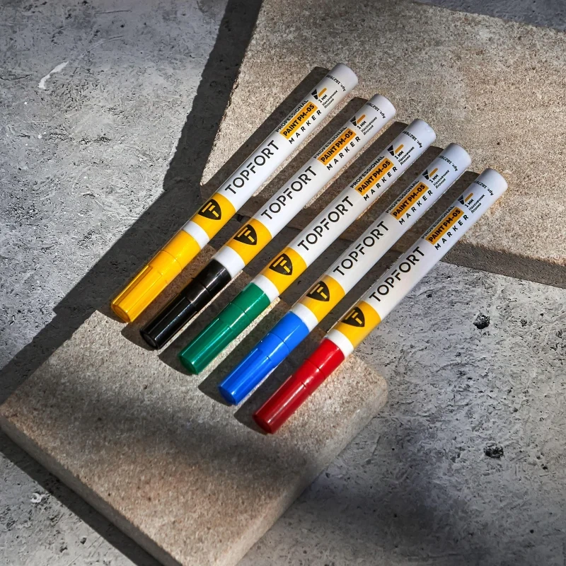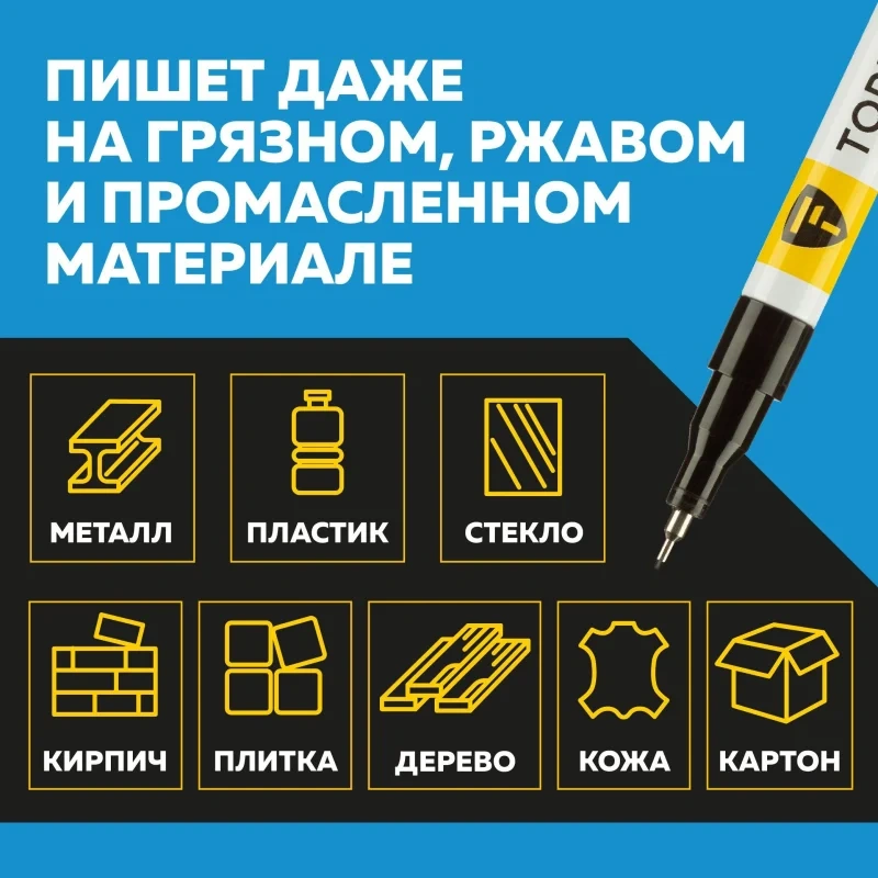 Маркер предназначен для универсальной перманентной маркировки различных материалов, таких как металл, стекло, пластик, дерево, резина, камень, кирпич, картон, текстиль, кожа и бумага. Этот маркер подходит для работы с гладкими и шероховатыми поверхностями, включая жирные, пыльные и грязные, что делает его идеальным для использования в сложных условиях.