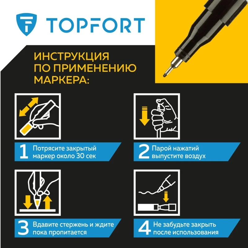 Предостережения: плотно закрывайте колпачок после применения, держать маркер вдали от источников тепла и воспламенения.