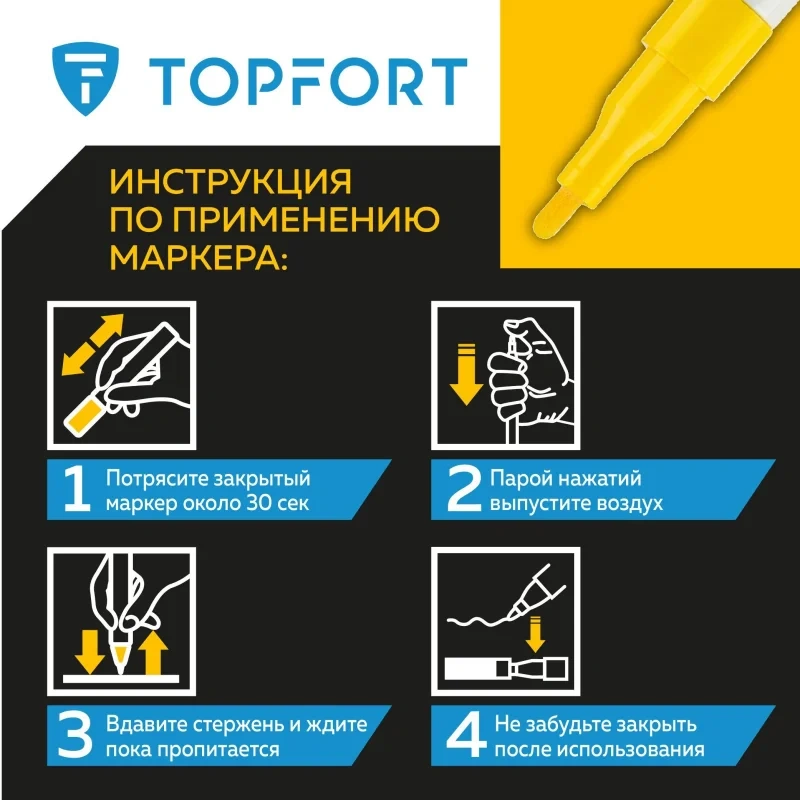 Предостережения: плотно закрывайте колпачок после применения, держать маркер вдали от источников тепла и воспламенения.