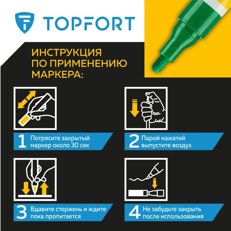 Предостережения: плотно закрывайте колпачок после применения, держать маркер вдали от источников тепла и воспламенения.