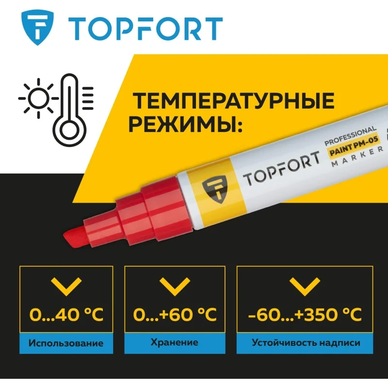 Маркер выполнен в алюминиевом корпусе и оснащён усиленным акриловым скошенным наконечником, который гарантирует долговечность и точность при использовании. Краска не содержит токсичных веществ, таких как ксилол и толуол, что делает её безопасной для работы. Клапанный механизм маркера исключает растекание и разбрызгивание краски, а также предотвращает её преждевременное пересыхание. Температура маркировки: от −60°С до +350°С. Температура поверхности: от −5°С до +40°С.