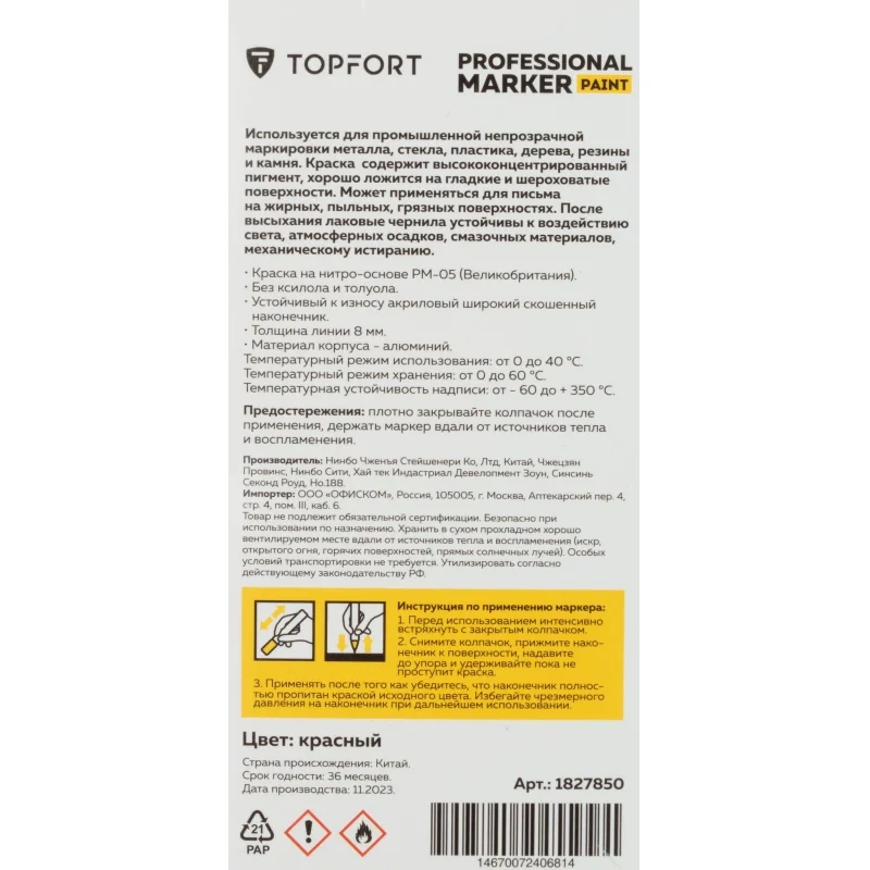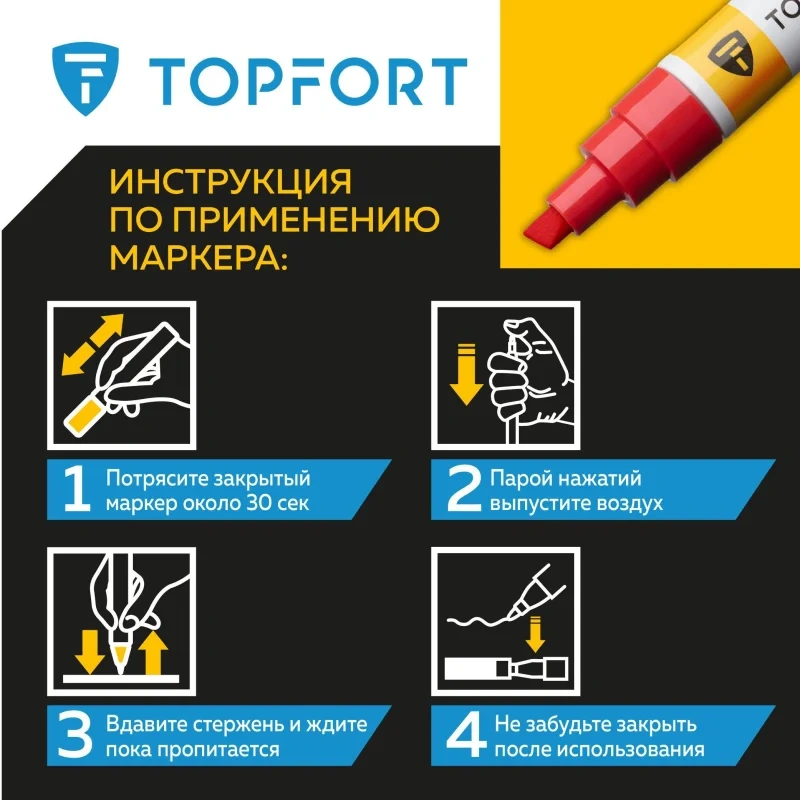 Предостережения: плотно закрывайте колпачок после применения, держать маркер вдали от источников тепла и воспламенения.