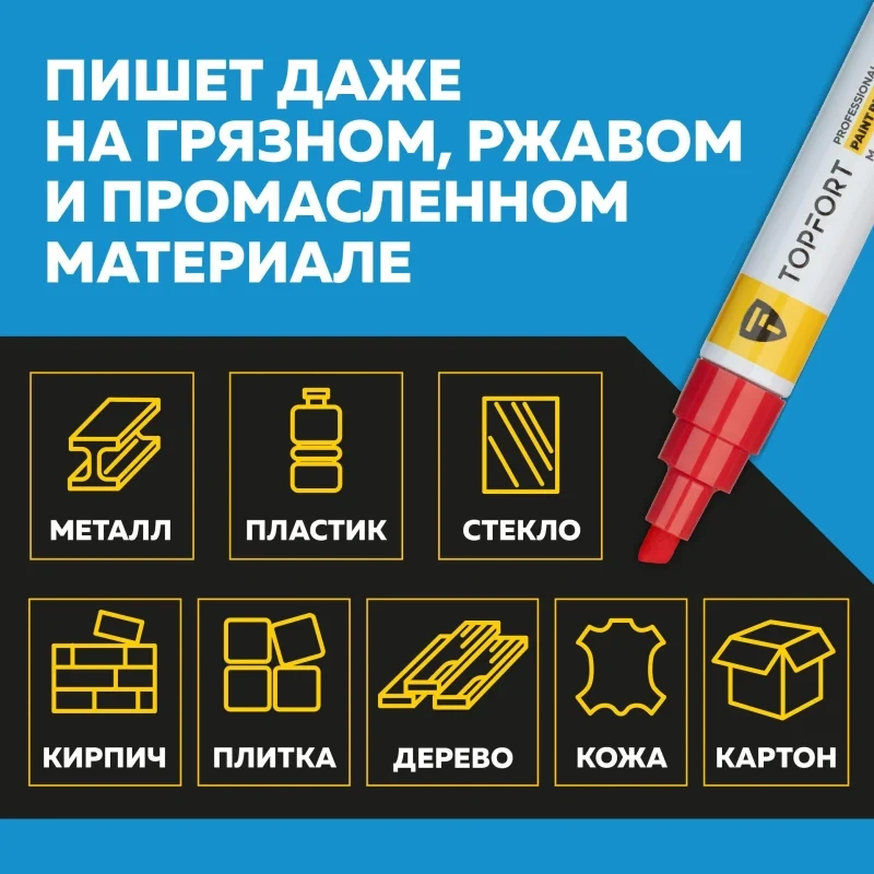 Маркер с скошенным наконечником и лаковой краской на нитрооснове предназначен для универсальной промышленной маркировки. Он идеально подходит для нанесения красной маркировки на различные материалы, такие как металл, стекло, пластик, дерево, резина, камень, картон, кирпич, текстиль, кожа и бумага. Краска с высокой концентрацией пигмента обеспечивает отличную адгезию как на гладких, так и на шероховатых поверхностях, включая жирные, пыльные и грязные. После высыхания лаковые чернила становятся стойкими к воздействию внешней среды: света, атмосферных осадков, смазочных материалов и механическому истиранию.