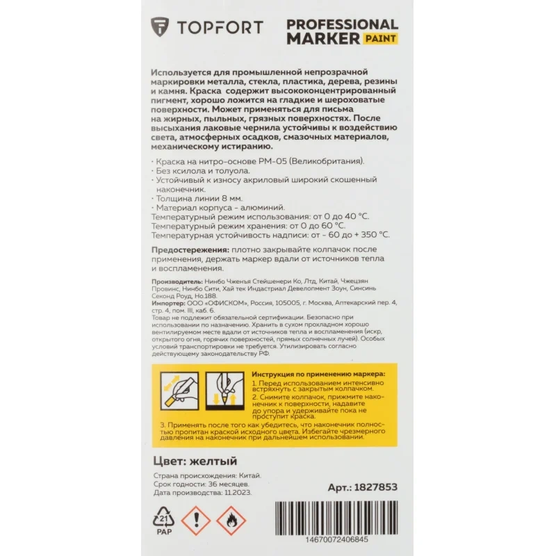 Предостережения: плотно закрывайте колпачок после применения, держать маркер вдали от источников тепла и воспламенения.яет 8 мм, что позволяет наносить широкие и чёткие линии. Этот маркер идеально подходит для промышленных нужд, где требуется долговечная и стойкая маркировка.