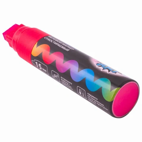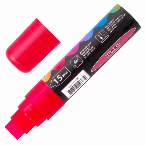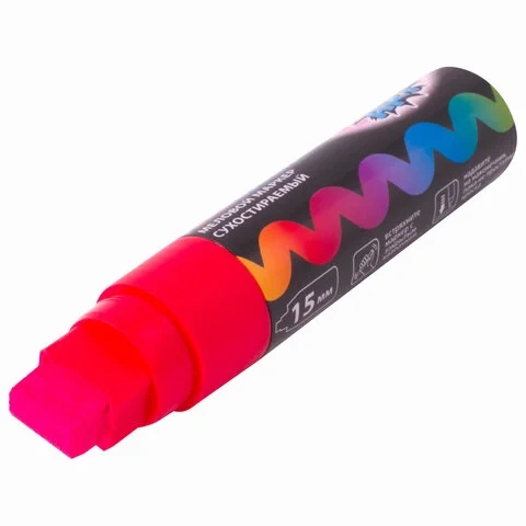 Предназначен для росписи, создания рисунков и надписей на зеркалах, стекле, меловой пленке и прочих гладких и прозрачных невпитывающих поверхностях. Рисунок получается плотный и яркий. Чернила на водно-меловой основе красного цвета без резкого запаха. Толщина линии письма - от 2 мм до 15 мм, зависит от угла наклона мелового маркера. Круглый корпус выполнен из пластика.