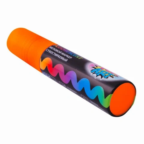 Предназначен для росписи, создания рисунков и надписей на зеркалах, стекле, меловой пленке и прочих гладких и прозрачных невпитывающих поверхностях. Рисунок получается плотный и яркий. Чернила на водно-меловой основе оранжевого цвета без резкого запаха. Толщина линии письма - от 2 мм до 15 мм, зависит от угла наклона мелового маркера. Круглый корпус выполнен из пластика.