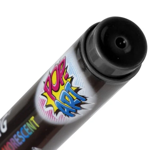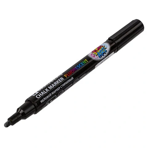 Предназначен для росписи, создания рисунков и надписей на зеркалах, стекле, меловой пленке и прочих гладких и прозрачных невпитывающих поверхностях. Рисунок получается плотный и яркий. Чернила на водно-меловой основе черного цвета без резкого запаха. Толщина линии письма - от 1 мм до 3,5 мм, зависит от угла наклона мелового маркера. Круглый корпус выполнен из пластика.