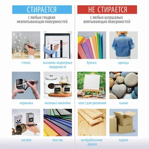 Предназначен для росписи, создания рисунков и надписей на зеркалах, стекле, меловой пленке и прочих гладких и прозрачных невпитывающих поверхностях. Рисунок получается плотный и яркий. Чернила на водно-меловой основе оранжевого цвета без резкого запаха. Толщина линии письма - от 1 мм до 3,5 мм, зависит от угла наклона мелового маркера. Круглый корпус выполнен из пластика.