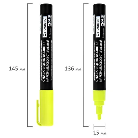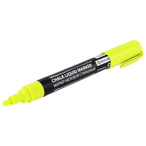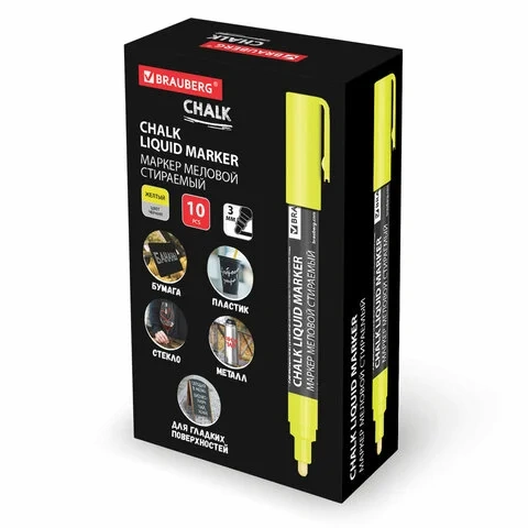 Маркер меловой CHALK LIQUID MARKER, ЖЕЛТЫЙ, 3 мм, стираемый, BRAUBERG 'CHALK', 152590