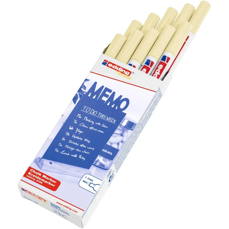 Уникальная особенность серии edding 4085 — наличие необычных цветов и тонкая линия письма — всего 1–2 мм, что является большой редкостью для меловых маркеров. Форма наконечника: круглая.