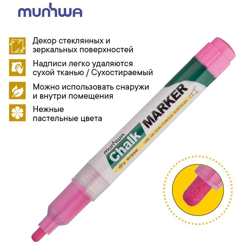 Маркер меловой MunHwa 'Chalk Marker' - жидкий мел на спиртовой основе. Мел-маркер- практичный и универсальный инструмент, который может быть использован для реализации широкого спектра задач.