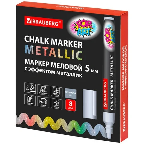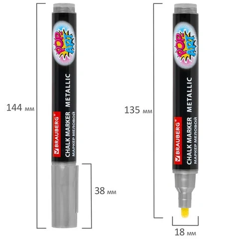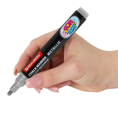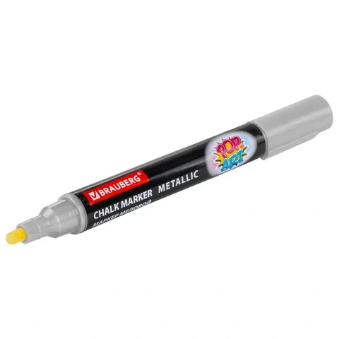 Маркер меловой 'POP-ART' СЕРЕБРЯНЫЙ, 5 мм, ВЛАГОСТИРАЕМЫЙ, для гладких поверхностей, BRAUBERG, 15248