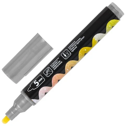Предназначен для росписи, создания рисунков и надписей на зеркалах, стекле, меловой пленке и прочих гладких и прозрачных невпитывающих поверхностях. Рисунок получается плотный и яркий. Чернила на меловой основе серебряного цвета с эффектом металлик без резкого запаха. Толщина линии письма - от 1 до 5 мм, зависит от угла наклона мелового маркера. Круглый корпус выполнен из пластика. Стирается влажной тканью.