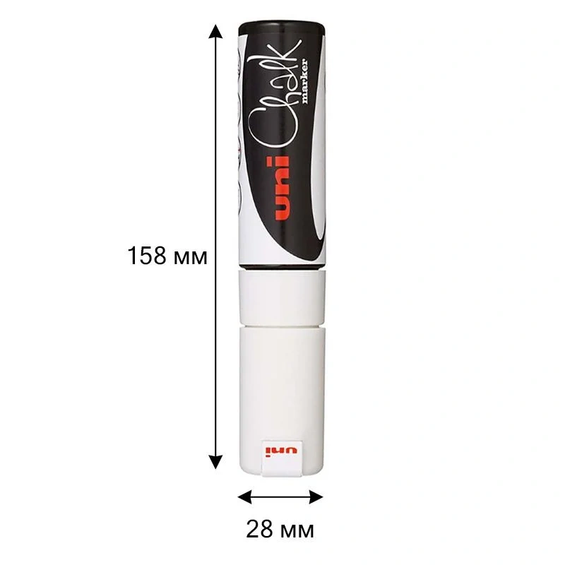 Меловой маркер Uni 'Chalk' 17K (Юни Чок) с клиновидным наконечником позволяет проводить линию толщиной до 15,0 мм. Благодаря жидкой консистенции меловую краску легко наносить практически на любые гладкие поверхности: металл, пластик, стекло, камень и фарфор. После высыхания маркер легко стирается мокрой тряпкой, но в то же время защищен от воздействия влаги и осадков.
