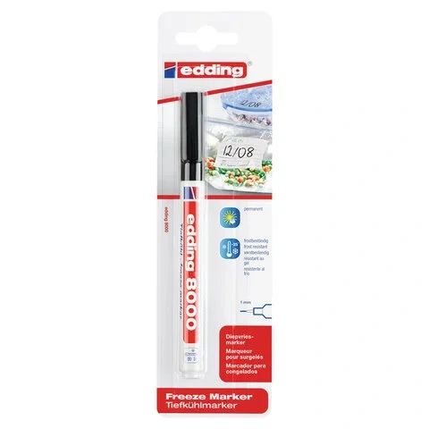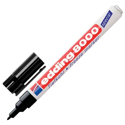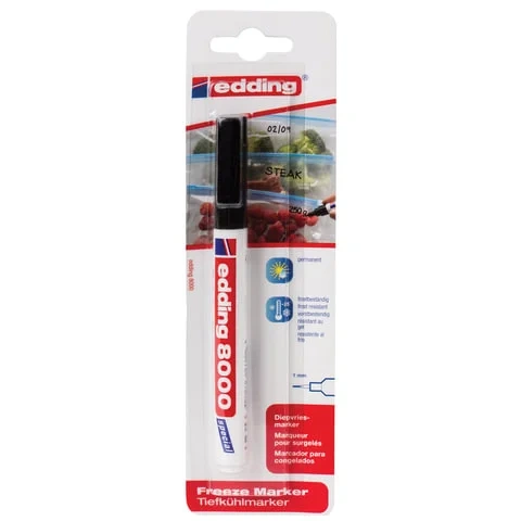 Маркер морозостойкий Edding E-8000/1 используется для нанесения надписей, подверженных замораживанию. Предназначен для маркировки и письма на пакетах, контейнерах для замораживания. Тонкий наконечник позволяет делать надписи на контейнерах даже маленького размера. Перманентные, быстросохнущие и морозоустойчивые чернила без добавления толуола и ксилола устойчивы к морозу, не замерзают и не густеют при контакте с холодной поверхностью и при эксплуатации в условиях пониженных температур. Чернила не проступают сквозь пакет для замораживания. Надписи устойчивы к температуре до -25 C, также устойчивы к выгоранию и не осыпаются при длительном хранении.Маркер для низких температур также подходит для работ по бумажным материалам, по сухому дереву, картону, пластику.Корпус маркера Edding E 8000/1 изготовлен из прочного пластика, что также упрощает его эксплуатацию в условиях пониженных температур. Пишущий узел маркера оснащен пулевидным наконечником.Внимание! Маркер Еdding 8000 не предназначен для письма на абразивных и сильно загрязненных поверхностях.
