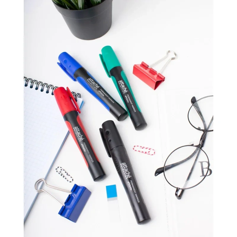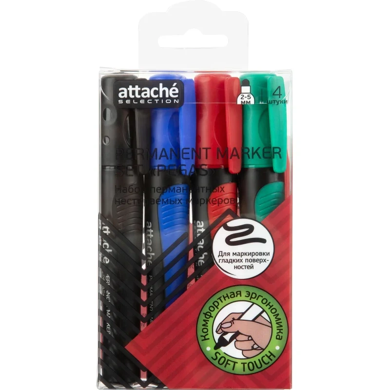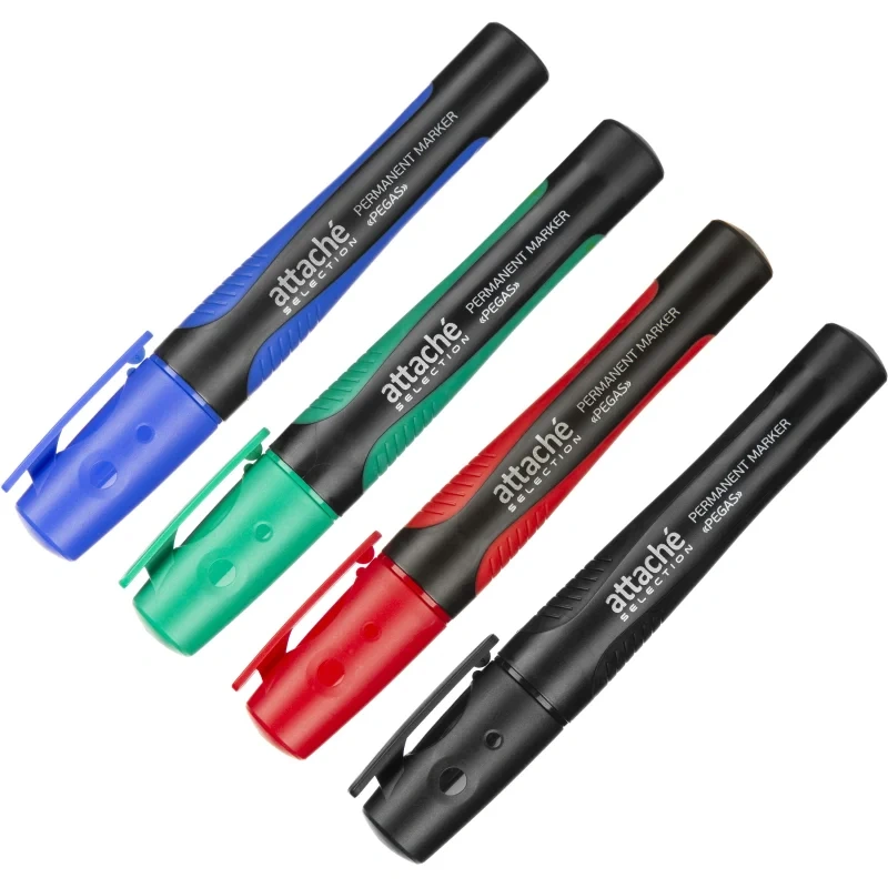 Особая нестираемая основа перманентного маркера Attache Selection Pegas обеспечивает такие качества, как стойкость к воздействию воды, ультрафиолета, низких и высоких температур. Можно маркировать, среди прочего, пластмассовые, деревянные, металлические, стеклянные или картонные предметы. В набор маркеров перманентных Attache Selection Pegas входят 4 цвета: черный, синий, красный, зеленый. Цвет колпачка соответствует цвету чернил. Круглый, эластичный наконечник обладает повышенной износостойкостью и обеспечивает экономный расход чернил. Отличается продленной линией письма. Изделие не перезаправляется. Плотно закрывается колпачком, что предотвращает высыхание наконечника и чернил. Толщина линии письма — 2-5 мм в зависимости от угла наклона. Спиртовая основа быстросохнущих чернил. Круглая форма корпуса из прочного пластика, с эргономичными вставками, колпачок снабжен клипом. Набор маркеров перманентных Attache Selection Pegas должен быть всегда под рукой!