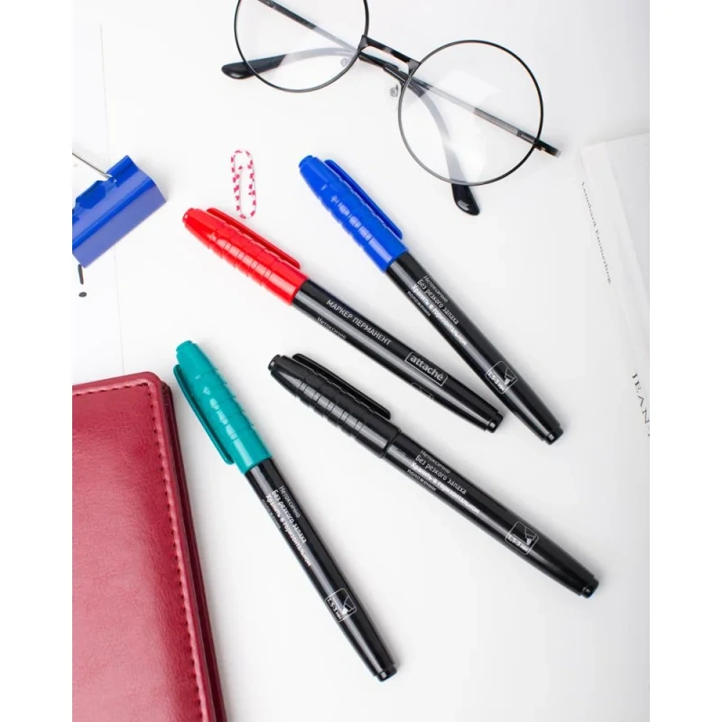 Особая нестираемая основа перманентного маркера Attache синего цвета обеспечивает такие качества, как стойкость к воздействию воды, ультрафиолета, низких и высоких температур. Можно маркировать, среди прочего, пластмассовые, деревянные, металлические, стеклянные или картонные предметы. Цвет колпачка соответствует цвету чернил. Фетровый, круглый, эластичный наконечник обладает повышенной износостойкостью и обеспечивает экономный расход чернил. Отличается продленной линией письма. Ресурс письма — линия около 180 м. Изделие не перезаправляется. Плотно закрывается колпачком, что предотвращает высыхание наконечника и чернил. Толщина линии письма — 1,5-3 мм в зависимости от угла наклона. Спиртовая основа быстросохнущих чернил. Круглая форма корпуса из пластика, колпачок снабжен клипом. Перманентный маркер Attache должен быть всегда под рукой!