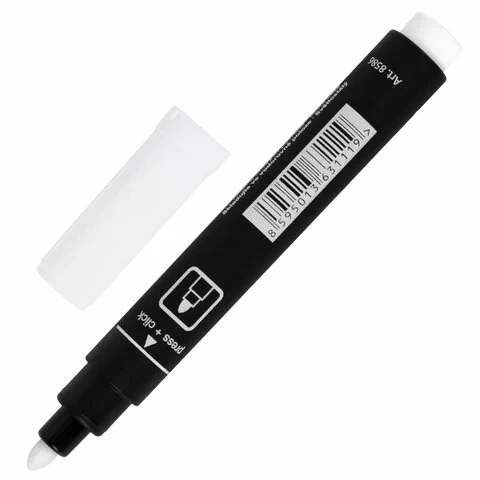 Перманентный маркер, белый. Предназначен для письма на большинстве поверхностей. Чернила на водной основе, светостойкие. После высыхания устойчив к воде, стиранию, атмосферным воздействиям. Пулевидный наконечник, толщина линии 2,5 мм. Хранить в горизонтальном положении.