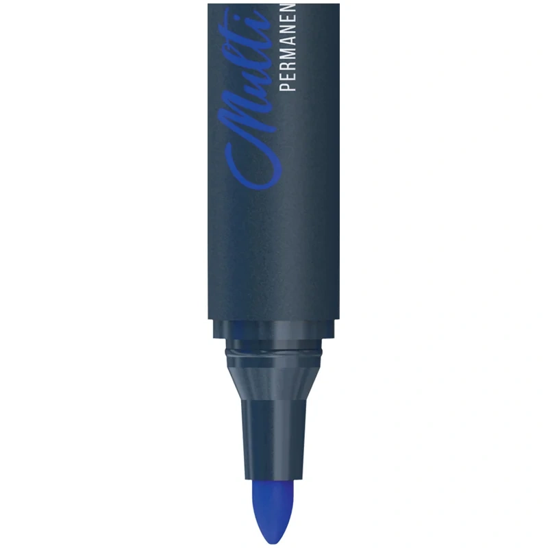 Перманентный маркер на спиртовой основе. Предназначен для письма на большинстве поверхностей: бумаге, коже, пластмассе, металле, резине, ткани. Устойчив к стиранию, воде, свету, температурным и атмосферным воздействиям. Толщина линии 3мм. Цвет синий. Упаковка - картонная коробка 12 штук.