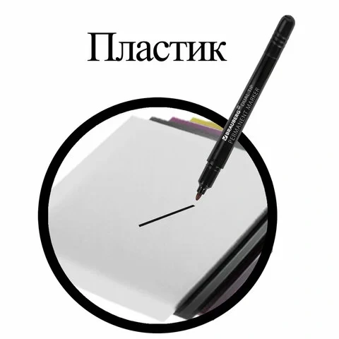 Маркер перманентный двусторонний черного цвета обладает круглой формой корпуса из пластика, диаметр которого 12 мм. На противоположных концах корпуса имеет два износостойких наконечника. Толщина линии письма круглого фетрового наконечника - 1 мм, тонкого металлического - 0,7 мм. Особая нестираемая основа перманентного маркера обеспечивает такие качества, как стойкость к воздействию воды, ультрафиолету, низких и высоких температур. Благодаря спиртовой основе чернила быстро сохнут и не размазываются. Изделие не перезаправляется. Плотно закрывается колпачком, что предотвращает высыхание наконечника и чернил. Цвет колпачков соответствует цвету чернил.