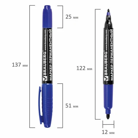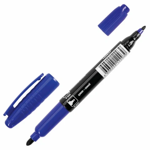 Маркер перманентный двусторонний синего цвета обладает круглой формой корпуса из пластика, диаметр которого 12 мм. Толщина линии письма - 2-4 мм в зависимости от наконечника. Особая нестираемая основа перманентного маркера обеспечивает такие качества, как стойкость к воздействию воды, ультрафиолету, низких и высоких температур. Благодаря спиртовой основе чернила быстро сохнут и не размазываются. Износостойкий фетровый наконечник устойчив к повреждениям и обеспечивает экономный расход чернил. Изделие не перезаправляется. Плотно закрывается колпачком, что предотвращает высыхание наконечника и чернил. Цвет колпачка соответствует цвету чернил.