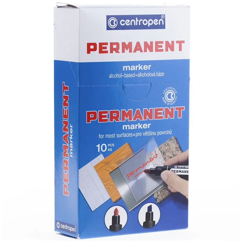 Перманентный маркер, красный. Предназначен для письма на большинстве поверхностей. Чернила на спиртовой основе, термостойкие (до 100°C). Устойчивый к воде, стиранию, атмосферным воздействиям. Клиновидный наконечник, толщина линии 1-4,6 мм.