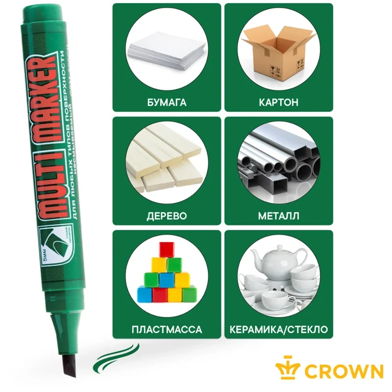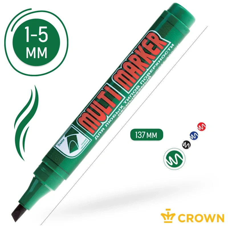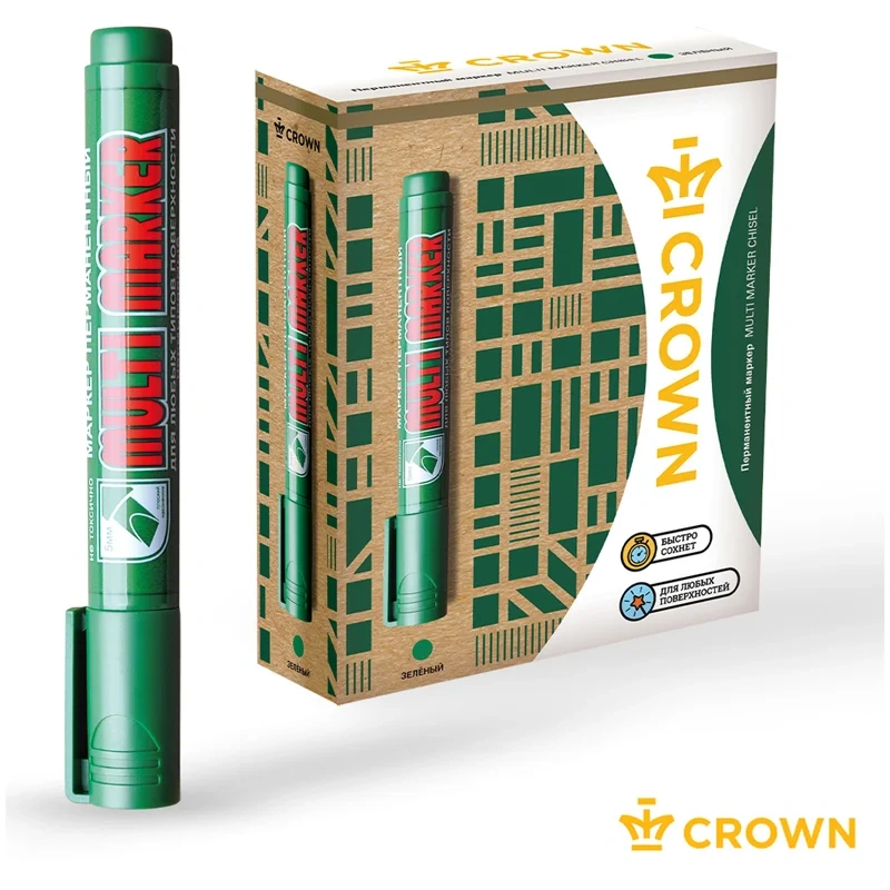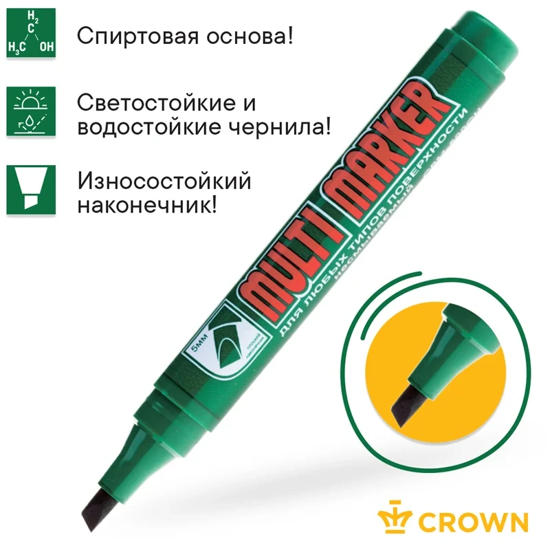 Перманентный маркер Crown 'Multi Marker Chisel' - универсальное решение для маркировки на всех типах поверхностей: металл, дерево, резина, бетон/камень/кирпич, стекло, пленка, картон и др.