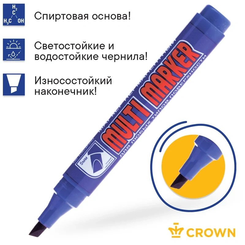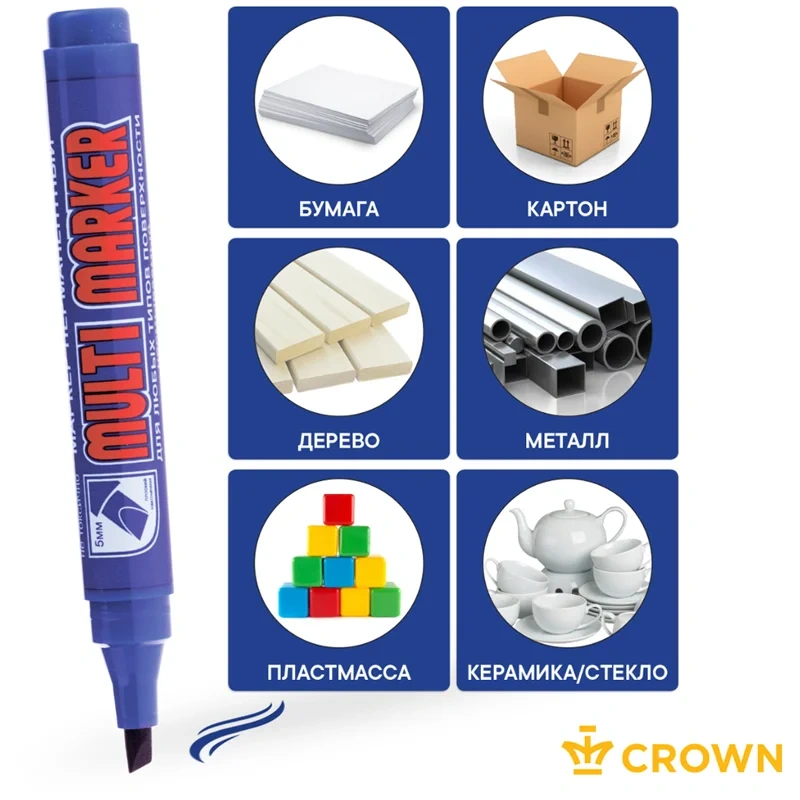 Перманентный маркер Crown 'Multi Marker Chisel' - универсальное решение для маркировки на всех типах поверхностей: металл, дерево, резина, бетон/камень/кирпич, стекло, пленка, картон и др.
