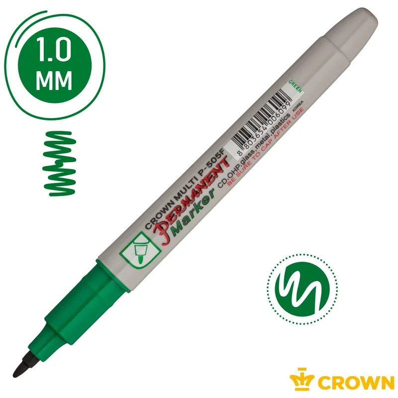 Маркер перманентный Crown Multi Marker Super Slim зеленый, 1мм, пулевидный наконечник