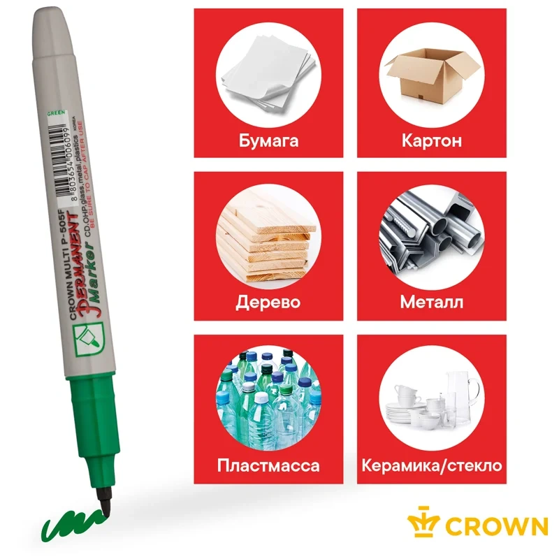 Перманентный маркер Crown 'Multi Marker Slim' - деликатная маркировки на всех типах поверхностей: металл, дерево, резина, бетон/камень/кирпич, стекло, пленка, картон и др, CD диски.