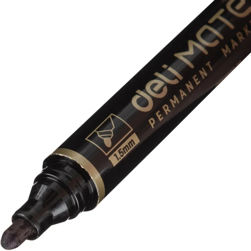 Маркер канцелярский не перезаправляется. Цвет колпачка с клипом соответствует цвету чернил. Такой перманентный маркер Deli должен быть всегда под рукой на работе и дома. Упакован в коробку.