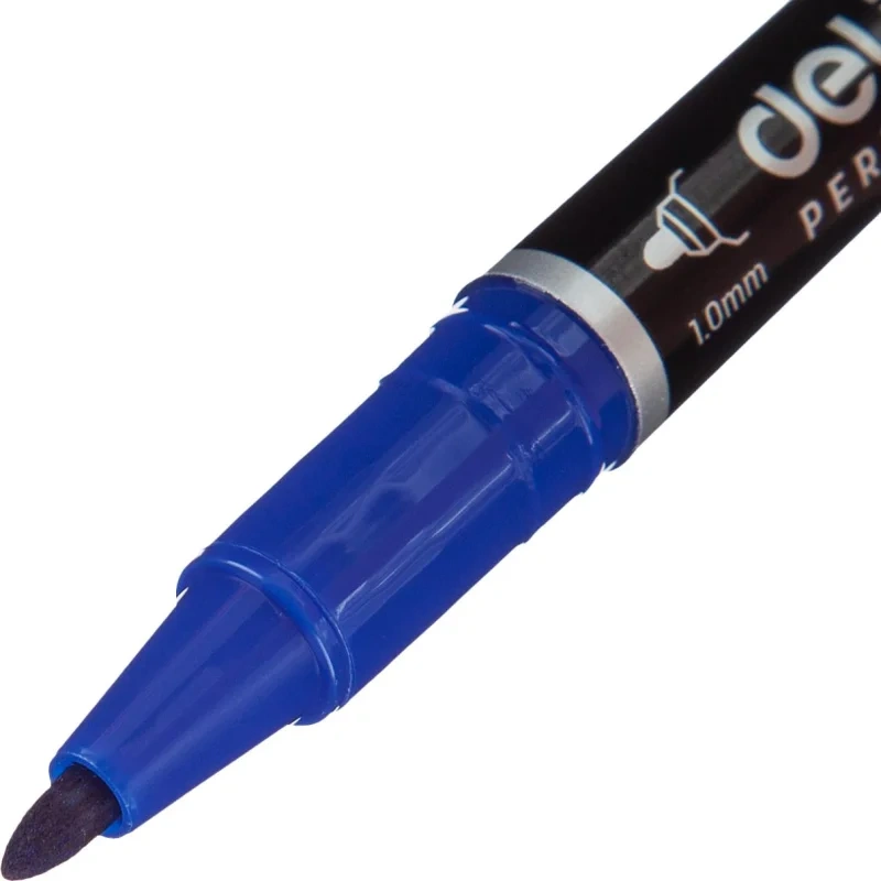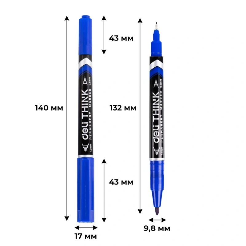 Маркер черный перманентный двусторонний Deli Think в прочном пластиковом корпусе. Нестираемые светостойкие чернила на спиртовой основе. Предназначены для письма на любой поверхности: бумага, полиэтилен, дерево, стекло, металл, натуральная кожа, ткань, камень, плитка. Форма наконечника: тонкая, круглая. Минимальная толщина линии письма 0,5 мм, на другой стороне расположен стрежень с максимальной толщиной линии 1 мм.