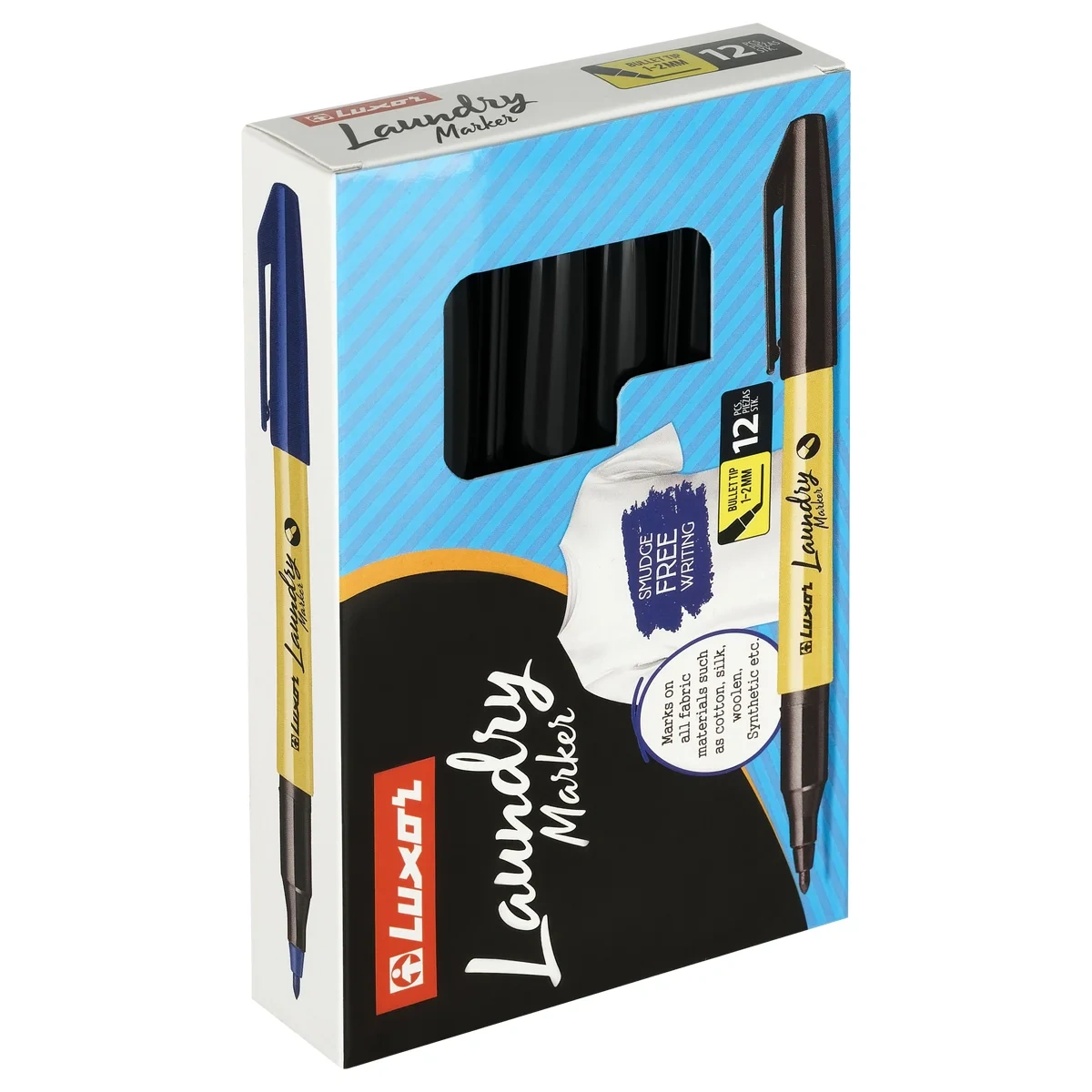 Перманентный маркер для ткани Luxor Laundry идеально подходит для простой и надёжной маркировки одежды, личных вещей из ткани и других видов работ по кастомизации текстильных изделий. Может с успехом использоваться в детских, медицинских учреждениях, воинских частях, а также в прачечных. Подходит для нанесения маркировки на текстиле как в быту, так и на производствах. Пулевидный пишущий узел позволяет создавать линии толщиной 1-2 мм. Маркер имеет круглый корпус, наполнен водостойкими высоко пигментированными чернилами на спиртовой основе, безопасен в применении. Цвет автоматически закрепляется через 24 часа, или после глажки. Не смывается при стирке до 90 градусов.