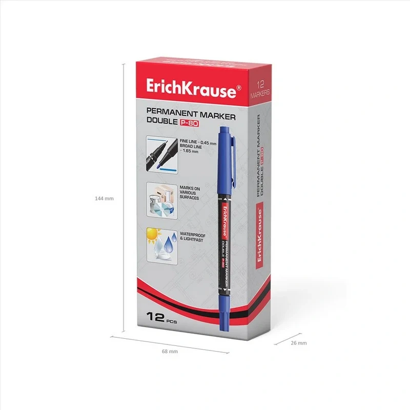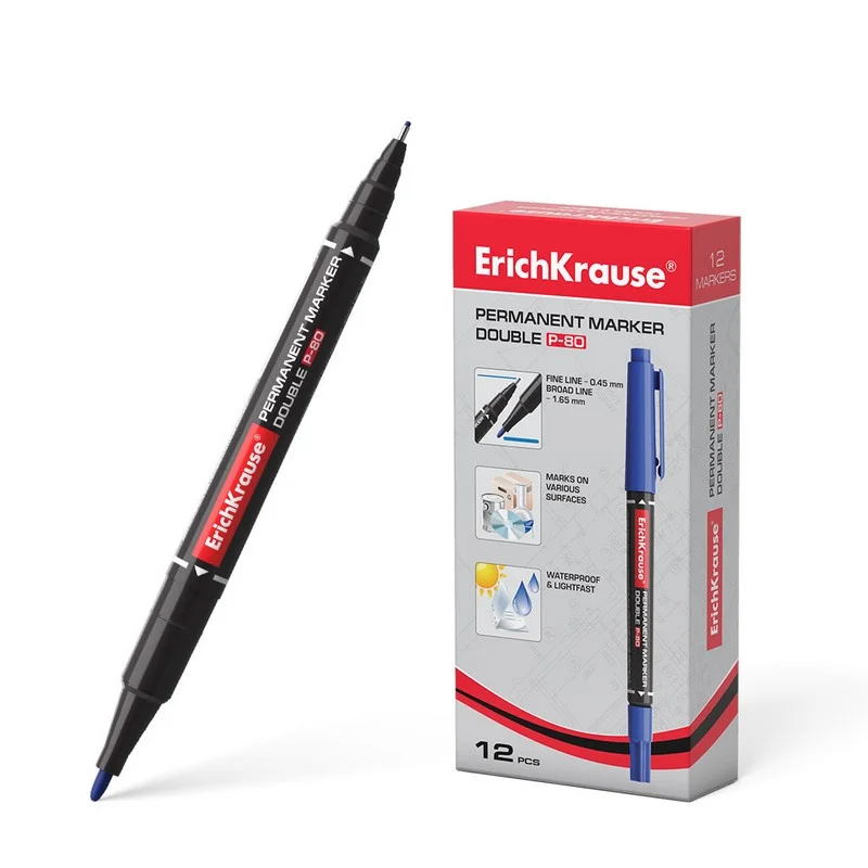 Универсальный перманентный маркер и линер 'два-в-одном'. Подходит для письма на любой поверхности, в том числе на CD/DVD дисках и OHP пленке. Имеет круглую форму корпуса и цветные колпачки, один из них с клипом. Цвет колпачков соответствует цвету чернил. Два наконечника: пулевидной формы и утонченный игольчатый наконечник Fine tip. Толщина линии пулевидного наконечника - 1.65 мм, утонченного игольчатого наконечника - 0.45 мм. Чернила на спиртовой основе, светостойкие, водостойкие. Не токсичны. Не содержат ксилол, толуол. Срок годности 5 лет.