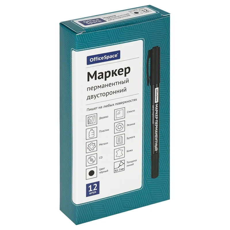 Двухсторонний перманентный маркер OfficeSpace предназначен для письма на большинстве поверхностей: бумаге, коже, пластмассе, металле, резине, ткани. Благодаря двум наконечникам можно делать разную маркировку: более заметную или деликатную. Толщина линии варьируется от 0,5 мм до 2 мм.