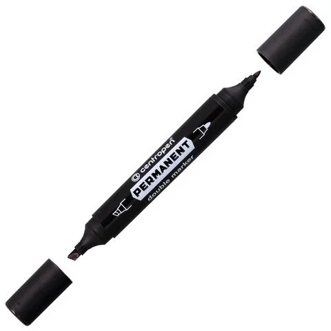 Перманентный маркер двухсторонний, черный. Предназначен для письма на большинстве поверхностей. Чернила на спиртовой основе, термостойкие (до 100°C). Устойчивый к воде, стиранию, атмосферным воздействиям. Пулевидный и клиновидный наконечник, толщина линии 1/1-4 мм.