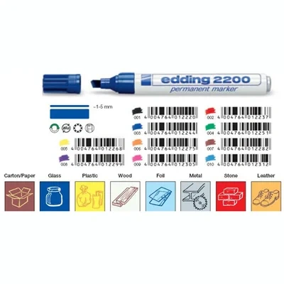Маркер Edding 2200 предназначен для нанесения постоянных, практически не удаляемых надписей на любые гладкие поверхности. Идеально подходит для работ по следующим поверхностям: металлу, дереву, стеклу, картону, пластику, керамике и т.д. Маркер является универсальным и также возможно письмо на ряде других поверхностей, таких как влажное дерево, грязный, ржавый металл, пленки, кафель и многих других.
