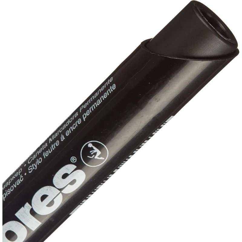 Перманентный маркер со скошенным наконечником. Цвет чернил: черный. Нестираемые чернила на спиртовой основе. Подходит для письма на различных поверхностях. Позволяет проводить линии толщиной 3–5 мм. Безопасно при использовании по назначению. Рекомендовано хранить в горизонтальном положении в сухом месте при температуре от 10 до 30°C. Устойчивость к высыханию при открытом колпачке до 10 дней. Размеры маркера с колпачком: 145×16 мм, без колпачка: 132×16 мм.