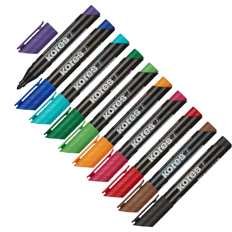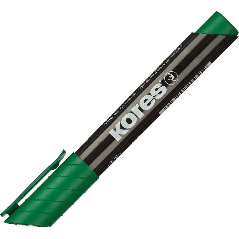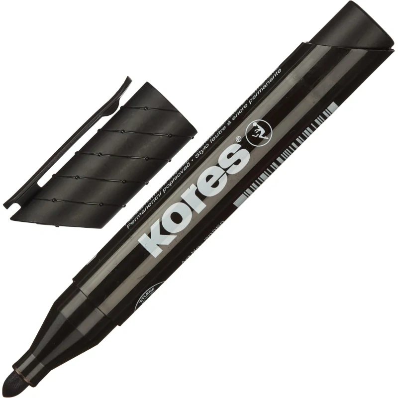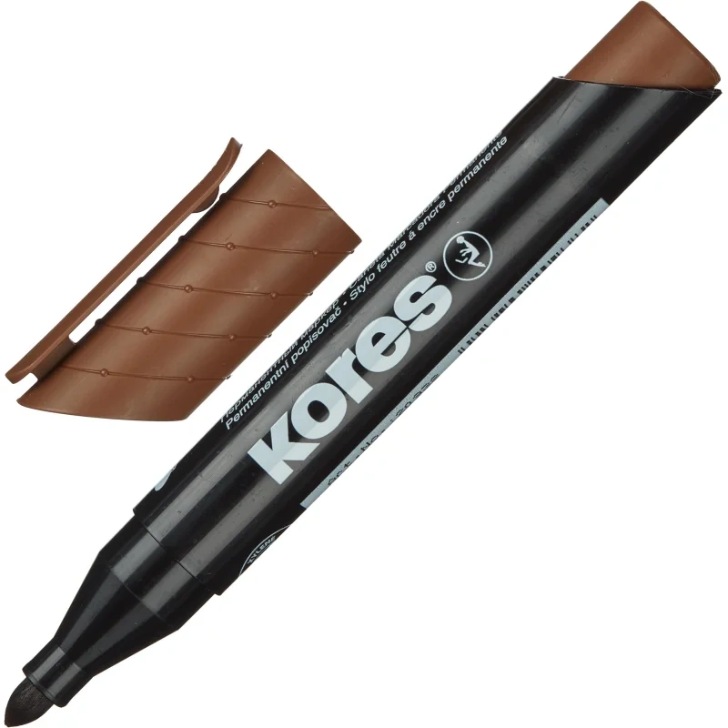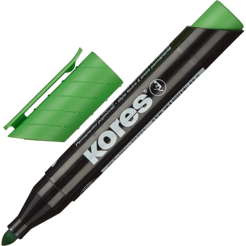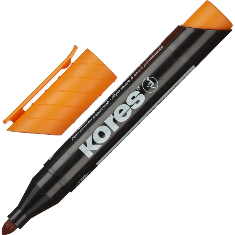 Перманентный маркер Kores с круглым наконечником. Цвет чернил: оранжевый, красный, розовый, фиолетовый, синий, бирюзовый, коричневый, салатовый, зелёный, чёрный. Нестираемые чернила на спиртовой основе. Подходит для письма на различных поверхностях. Позволяет проводить линии толщиной 1-3 мм. Безопасен при использонии по назначению. Хранить в горизонтальном положении в сухом месте при температуре от 10 до 40 ?C. Маркеры соответствуют требованиям ТР ТС 007/2011. Изготовлено в Чехии.