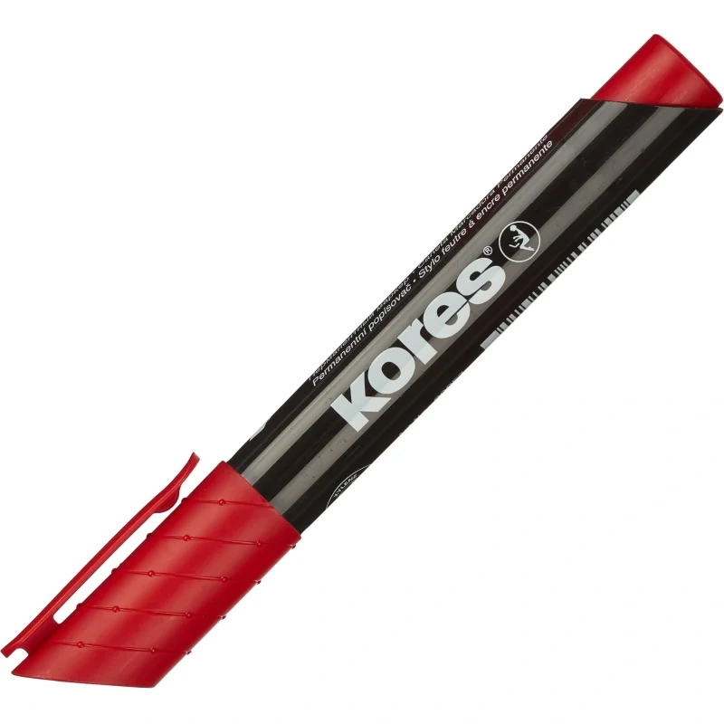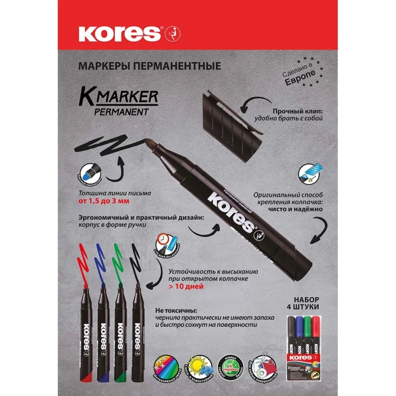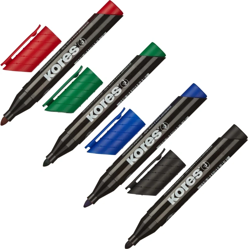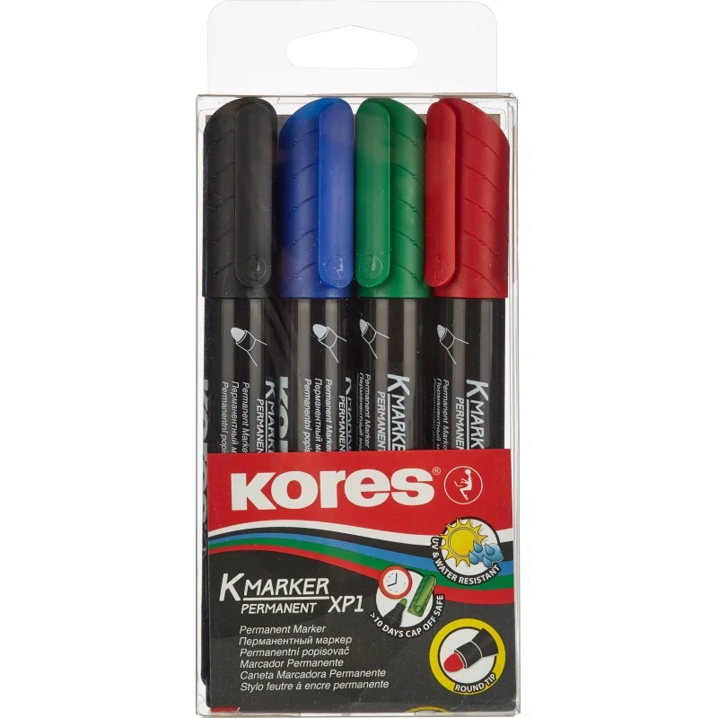 Набор перманентных маркеров Kores 20943 в прозрачной упаковке. Эргономичный корпус маркеров изготовлен из пластика. Круглый наконечник обеспечивает толщину линии от 1.5 до 3 мм. Размеры маркера с колпачком: 145×16 мм, без колпачка: 132×16 мм. Страна производства — Чешская республика. Цвета в наборе — синий, черный, красный, зеленый. Снятый колпачок не потеряется благодаря тому, что во время работы его можно надевать на верхнюю часть маркера. Устойчивость к высыханию при открытом колпачке до 10 дней.