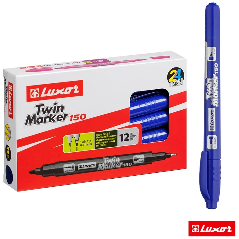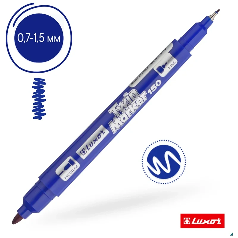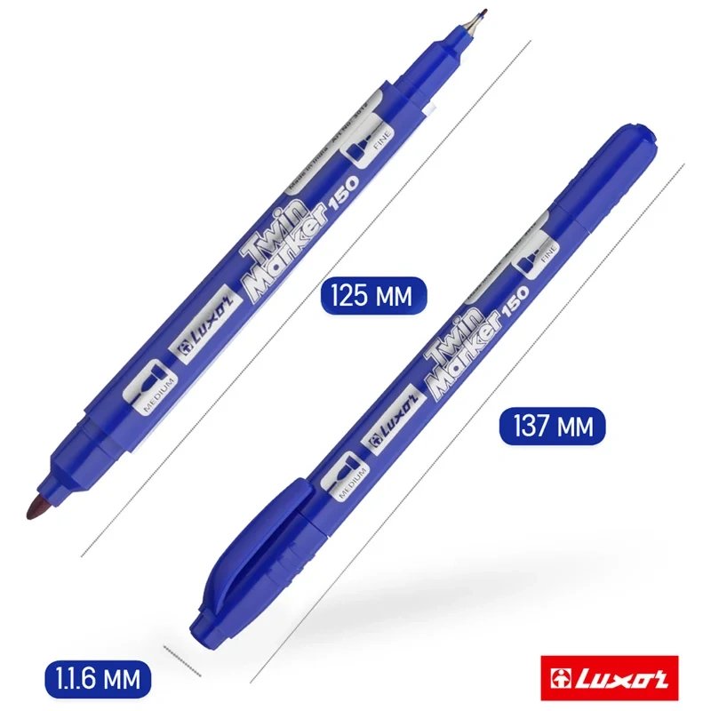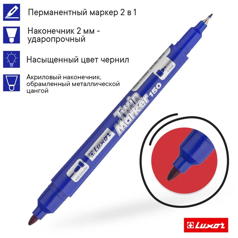 Двухсторонний перманентный маркер Luxor 150 – два маркера в одном. Двухсторонний наконечник 0,7мм и 1 мм позволяет наносить линии разной толщены. Подходит для повседневной и для деликатной маркировки на всех типах поверхностей: CD диски, металл, дерево, резина, бетон, камень, кирпич, стекло, пленка, картон.