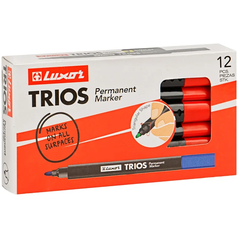 Эргономичный перманентный маркер Luxor 'Trios' - универсальное решение для маркировки на всех типах поверхностей: металл, дерево, резина, бетон, камень, кирпич, стекло, пленка, картон.