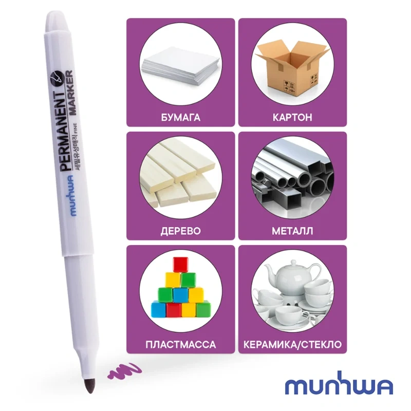 Перманентный маркер MunHwa - деликатная маркировка на всех типах поверхностей: резина, дерево, металл, пластик, ПВХ, бетон, кирпич, плитка, стекло, керамика, картон, текстиль, кожа.