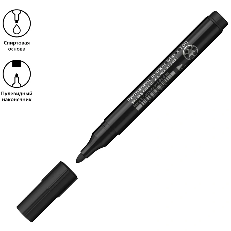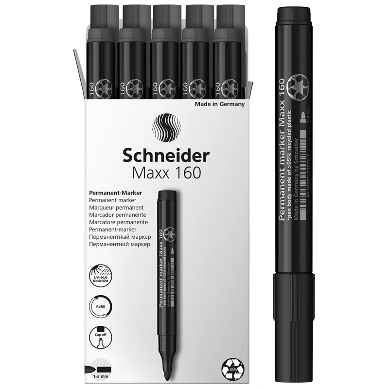 Перманентный маркер Schneider Maxx 160 с чернилами на спиртовой основе подходит для большинства твёрдых поверхностей. Маркер представлен с пулевидным пишущем узлом. Цвет чернил - чёрный, толщина линии варьируется от 1 до 3 мм. Изделие может находиться без колпачка до 3 дней и не высыхать. Надписи не выцветают и не размазываются. Безопасен для использования и не содержит ксилол и толуол.