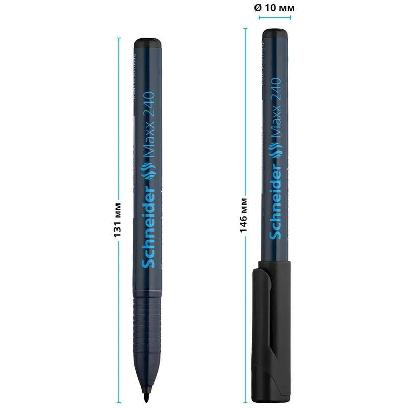 Маркер перманентный Schneider Maxx 240 с чернилами на спиртовой подходит для письма на большинстве твёрдых поверхностей, включая картон, бумагу, металл, стекло, дерево и пластик. Маркер может находиться без колпачка до 3 дней и не высыхает. У изделия с пулевидным наконечником толщина линии письма составляет 2 мм. Маркеры из 10 штук упакованы в картонную коробку.