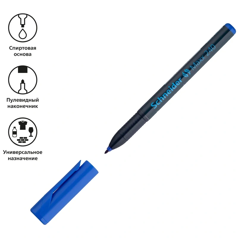 Маркер перманентный Schneider Maxx 240 с чернилами на спиротовой основе подходит для письма на большинстве твёрдых поверхностей, включая картон, бумагу, металл, стекло, дерево и пластик. Маркер может находиться без колпачка до 3 дней и не высыхает. У изделия с пулевидным наконечником толщина линии письма составляет 2 мм. Маркеры из 10 штук упакованы в картонную коробку.