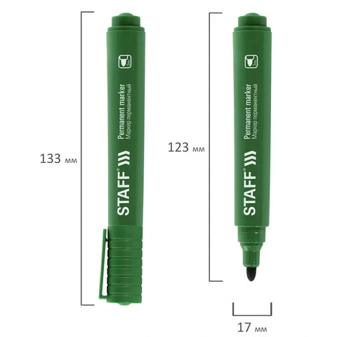 Маркер перманентный зеленого цвета обладает круглым корпусом, диаметр которого 17 мм и длина 133 мм. Толщина линии письма - 3 мм. Особая нестираемая основа перманентного маркера обеспечивает такие качества, как стойкость к воздействию воды, низких и высоких температур. Благодаря спиртовой основе чернила быстро сохнут и не размазываются. Износостойкий наконечник устойчив к повреждениям и обеспечивает экономный расход чернил. Изделие не перезаправляется. Плотный колпачок с клипом предотвращает высыхание наконечника и чернил. Цвет корпуса и колпачка соответствует цвету чернил.