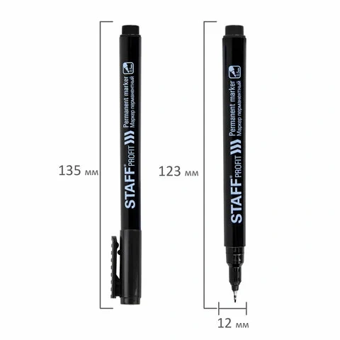 Маркер перманентный черного цвета обладает тонким круглым корпусом, диаметр которого 12 мм и длина 135 мм. Толщина линии письма - 0,5 мм. Особая нестираемая основа перманентного маркера обеспечивает такие качества, как стойкость к воздействию воды, низких и высоких температур. Благодаря спиртовой основе чернила быстро сохнут и не размазываются. Износостойкий наконечник устойчив к повреждениям и обеспечивает экономный расход чернил. Изделие не перезаправляется. Плотный колпачок с клипом предотвращает высыхание наконечника и чернил. Цвет корпуса и колпачка соответствует цвету чернил.